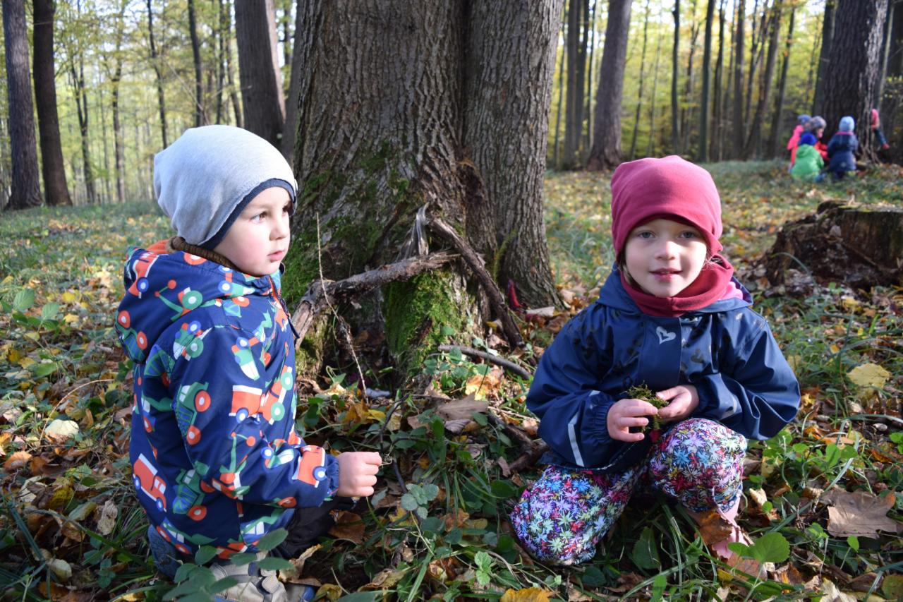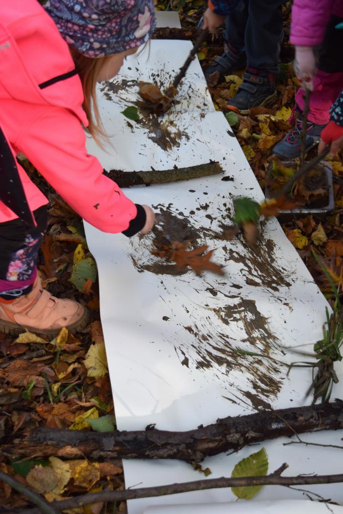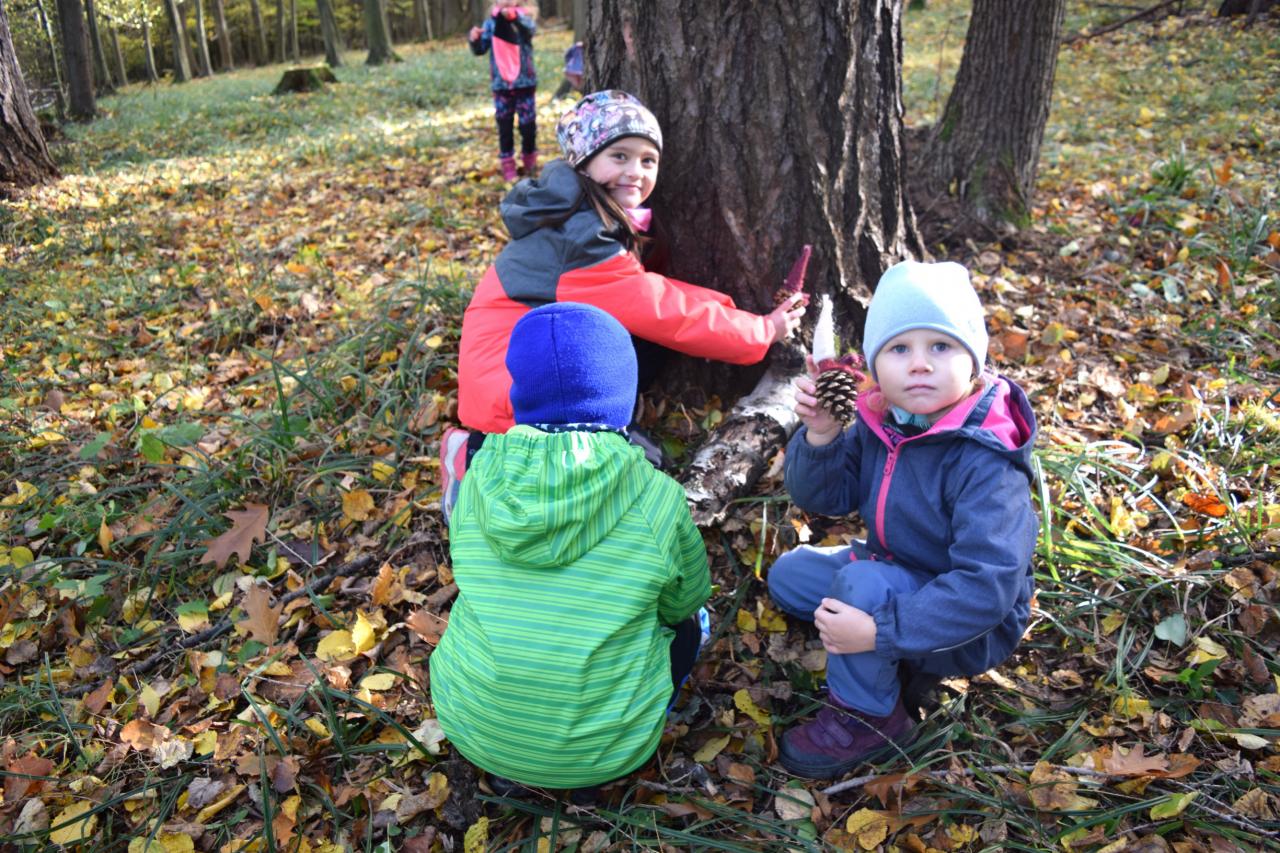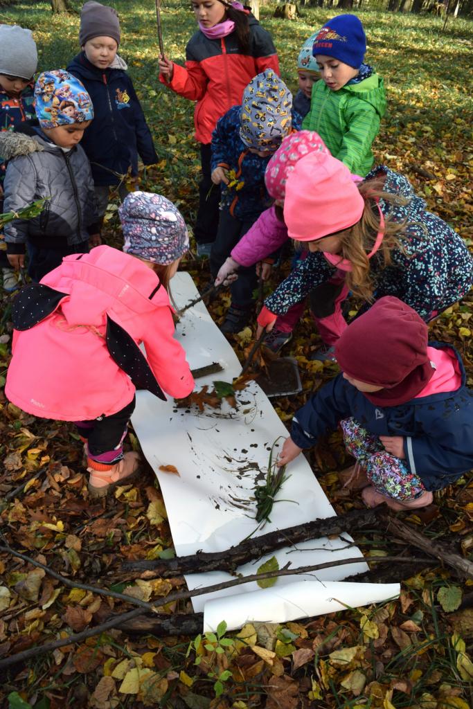 Postavit svému střítkovi domeček v lese, vyrobit si "štětec" z toho, co les dal a namalovat si obraz blátem. Ale hlavně obdivovat krásu lesa. To byl náš projektový den v MŠ.