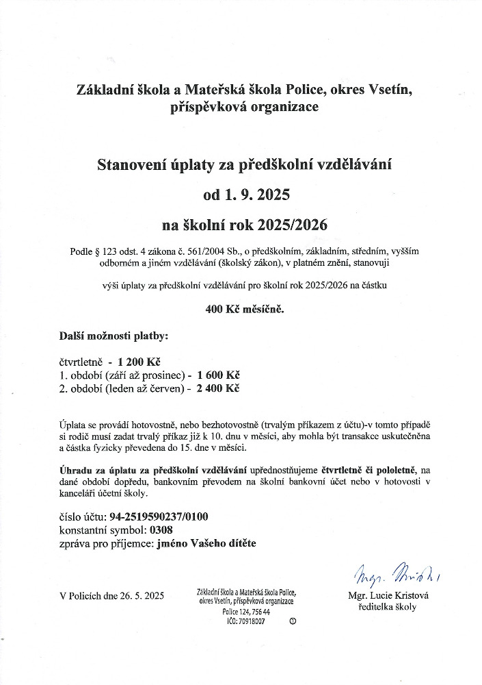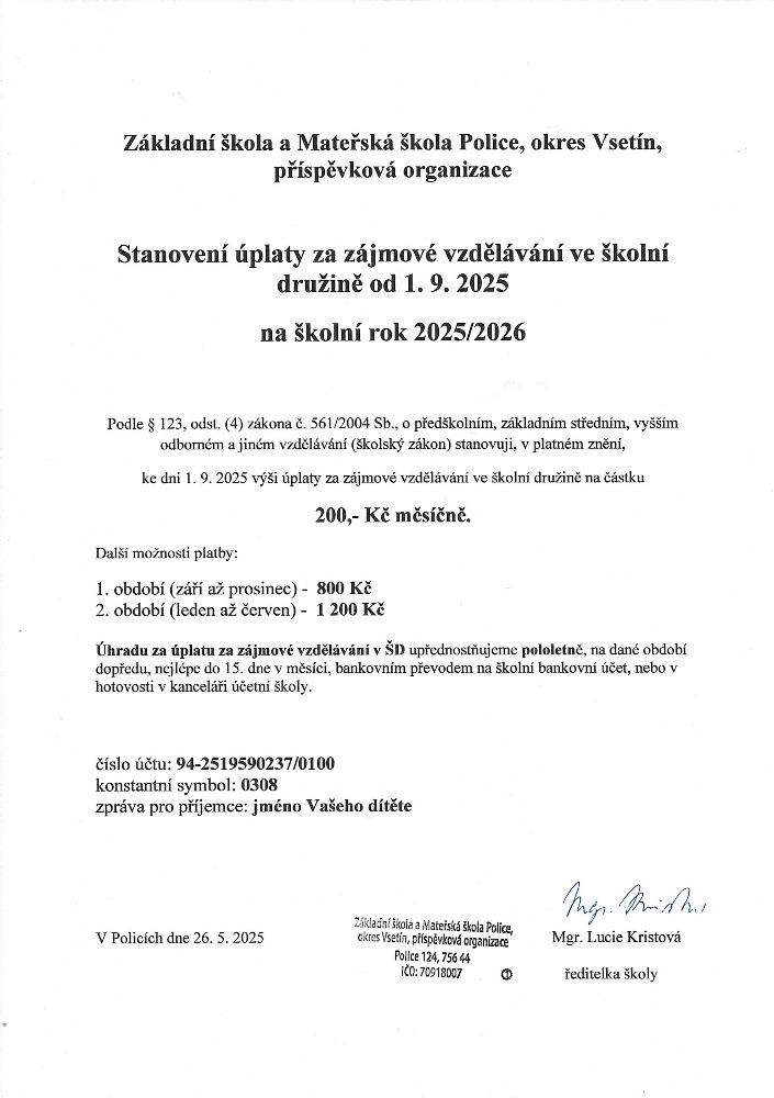 Stanovení úplaty na školní rok 2025/2026.